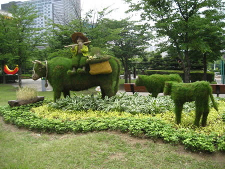 Patung tanaman ternyata tidak hanya terbuat dari tanaman merambat seperti jenis teh-tehan, melainkan rumputpun bisa dijadikan patung. Hasilnya tidak kalah bagus, tapi memang harus dibuatkan dulu dasar cetakannya (moulding) terlebih dahulu. Tapi memang kelihatan lebih halus hasilnya. Bikin yuk di halaman rumah...
